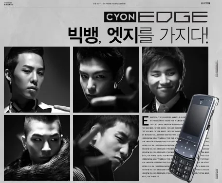 负责此次广告拍摄的LG电子韩国MC事业部CYON市场营销团队负责人李钟镇表示:我们在广告中捕捉到了人气爆棚的Bigbang的个人魅力,以此来展现CYON Edge手机的时尚感和专业性。我们期待Edge手机能够凭借Bigbang新推出的、备受瞩目的Edge广告,给消费者留下深刻印象并获得热烈反响