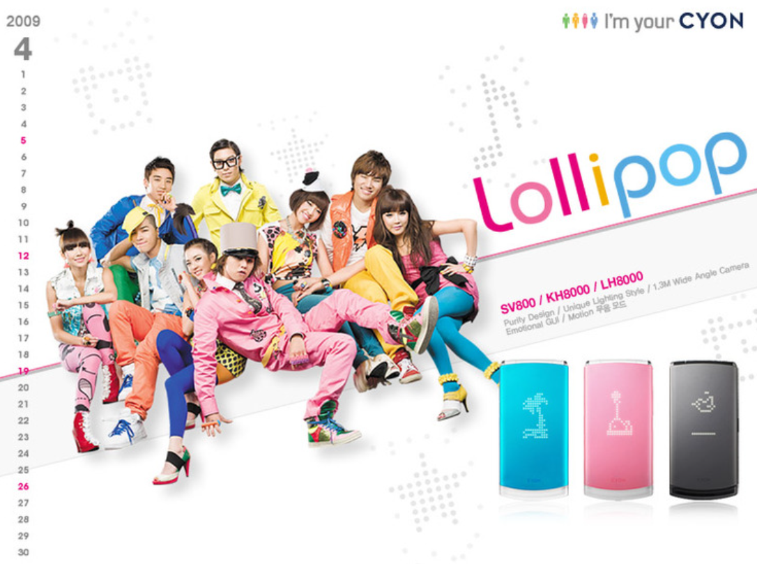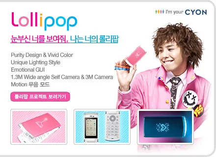 LG电子宣布Bigbang和2NE1合作发行的歌曲《LOLLIPOP》将用于宣传 CYON手机(型号:LG-SV800、KH8000、LH8000)