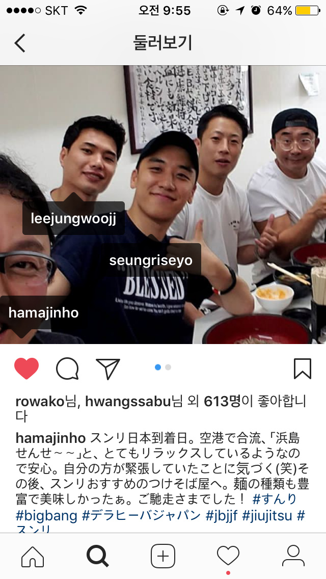 胜利抵达日本的那天。我们在机场见面,他说:“滨岛老师~~”,看到他看起来很放松,我松了一口气。我意识到其实我更紧张(哈哈)。之后,我们去了胜利推荐的一家荞麦面店。那里面种类繁多,味道鲜美。谢谢你的盛宴!#胜利 #bigbang #delahivajapan #jbjjf #jiujitsu #seungri