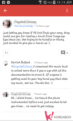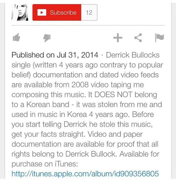 图片翻译:Derrick Bullock的这首单曲(与普遍认知相反,它创作于四年前)的资料和视频记录可以追溯到2008年,记录了我创作这首歌的过程。这首歌不属于任何韩国乐队——它四年前被盗用,并在韩国的音乐作品中使用。在你指责Derrick盗用这首歌之前,请先搞清楚事实。视频和书面资料可以证明所有版权均归Derrick Bullock所有