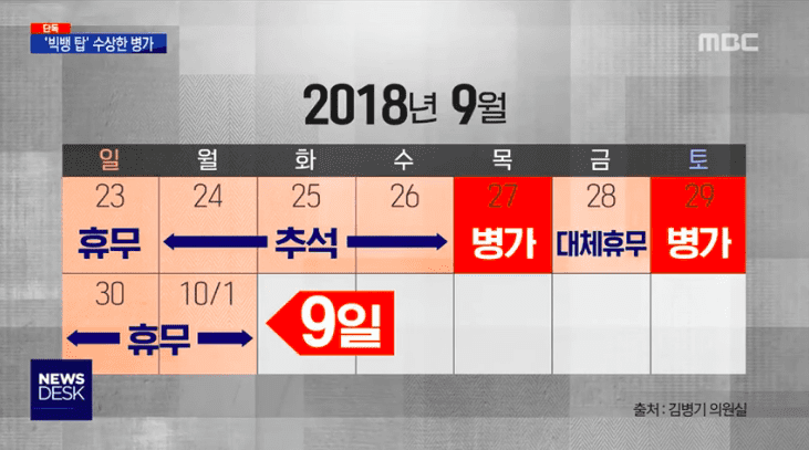 《MBC新闻台》报道了TOP的工作日历,发现他的病假天数比同事多得多,而且大多安排在其他休息日之前或之后